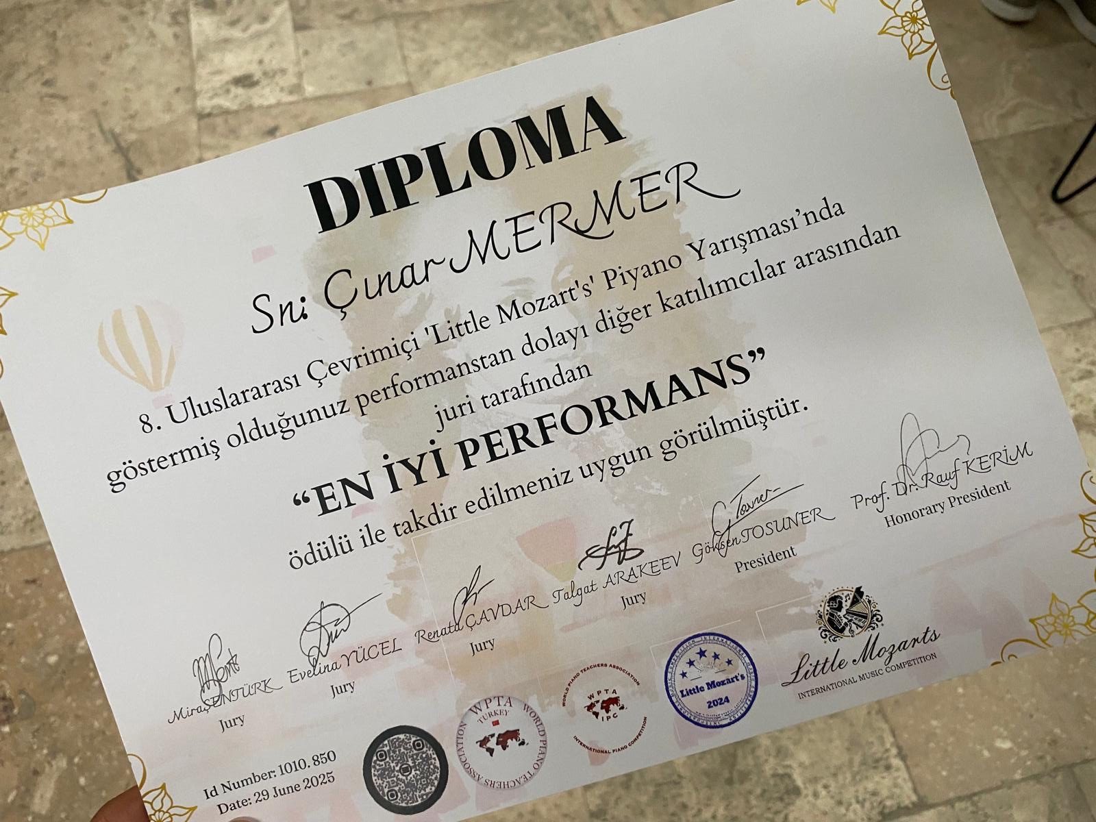 Öğrencimiz Çınar MERMER, katıldığı 8.Little Mozart Piyano Yarışması’nda “Grand Prize” ve ”En İyi Romantik Dönem Eser Yorumlama” ödülü alarak Kapadokya’da gerçekleşen 9. Little Mozart Piyano Yarışması’nın Gala açılış konserini yapmak için davet edilmiştir. Bu harika başarı için öğrencimizi tebrik ederiz.